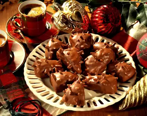 Remove the gingerbread almond corners from the oven and let them cool on a cake rack. Carefully melt the chocolate coating in a water bath while stirring. Dip the gingerbread almond corners into the chocolate. Place on a baking tray lined with baking paper to dry.