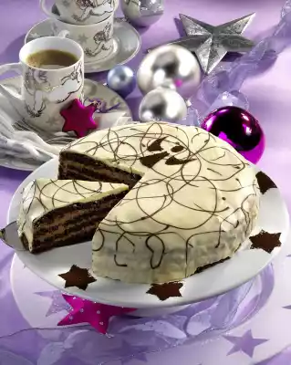 Cut the base 3 times horizontally. Whip the chocolate cream for about 1 minute until creamy. 1⁄3 Spread the cream on the 1st cake base, place the 2nd cake base on top. 1⁄3 Spread the cream on top. 3. lay the base on top, spread the rest of the cream on top. Finish with the fourth base. Coarsely chop the chocolate coatings separately. Melt the white couverture and coconut oil in a hot water bath. Cover the cake with it. Melt the dark couverture, put it into a freezer bag and cut off a small corner at the bottom. Decorate the cake with it. Chill for about 1 hour. Dust the angels and stars on the cake and cake plate with cocoa using cutters or a stencil