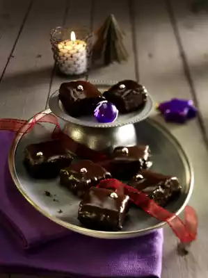 Place the mould on an oven rack. Bake in the preheated oven (electric cooker: 150 °C/ convection oven: 125 °C/ gas: level 1) for 35-40 minutes. Take out brownies, let them cool down and cut into 20 pieces. Chop the chocolate coating, add the chocolate flakes (enclosed in the package) and melt over a warm water bath. Cover the brownies with the chocolate. Decorate with 1 silver pearl each and allow to set