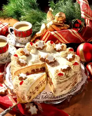 Cream and finally fold in the gingerbread. Cut the sponge cake once and place a cake ring around the bottom cake layer. Sprinkle the cake with orange juice. Spread half of the cream on the lower cake base.