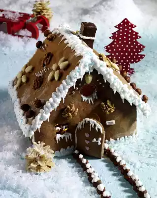 If it is too thick, add some lemon juice. Pour the icing into a piping bag with a small perforated spout or cut it off into a freezer bag and a small corner. First glue the house frame together and let it dry for about 20 minutes, then fix the two roof panels with the icing and let them dry. Cut a chimney from dominoes. Fix the chimney and door with icing as well and decorate the house with icing on the edges, nuts and sugar beads