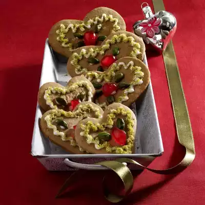 Refrigerate one half. Roll out the second half on a floured work surface. Cut out hearts in different sizes (6-7 cm length). Place hearts on 1 baking tray lined with baking paper. Bake in the preheated oven (electric cooker: 200 °C/ convection oven: 175 °C/ gas: level 3) for 8-10 minutes. Pull the pastry with the baking paper onto the cake rack and let it cool down. Process the remaining dough in the same way. Sift icing sugar. Place the egg whites, icing sugar and lemon juice in a tall mixing bowl and whip to a creamy glaze. Pour the icing into a freezer bag and cut off a small corner. Pour the icing onto the hearts as desired. Sprinkle with ground pistachios.