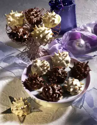Then leave to dry in the switched off oven for another 5 minutes. Remove from the oven, place on a rack and allow to cool. Coarsely chop white and dark chocolate separately. Melt the couverture separately in two small bowls in a hot water bath. Cover half of the hedgehogs with white chocolate coating. Coat the rest of the hedgehogs with dark chocolate. Place on a grid and allow to dry
