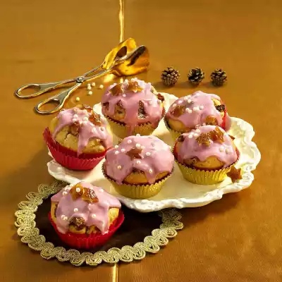 Bake in the preheated oven (electric range: 175 °C/ convection oven: 150 °C/ gas: level 2) for approx. 25 minutes. Remove from the oven and let cool on a cake rack. Cut out small stars from the remaining dates. Mix icing sugar and cherry nectar to a thick icing. Spread over the muffins and decorate with stars and pearls