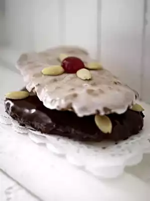Coat 9 gingerbreads with chocolate coating and icing. Decorate the gingerbread with cherries and almonds and leave to dry. If possible, put both varieties separately in well-closing cookie tins.