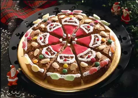 Stir the rest of the icing a little thinner with a little water and colour with red food colouring. Spread the tips of the cake pieces as red caps. Cut off a small corner from the freezer bag, splash hair, beard, face and mantle seam on each cake piece.