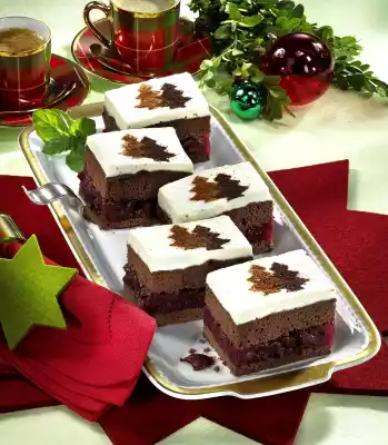Remove from the heat, stir in the cherries and let it cool down a bit. Remove the sponge cake base from the mould and cut through horizontally once. Place the edge of the springform pan around the lower base. Spread the compote on the base. Cover with the 2nd cake base and chill for about 30 minutes. Whip the cream until stiff, while pouring in 1 sachet of vanilla sugar. Spread on the cake surface. Chill for about 2 hours. Remove cake edge. Cut the cake into 12 pieces. Mix one teaspoon of icing sugar with cinnamon or cocoa. With the help of a stencil, sieve one light and one dark fir tree onto each piece.