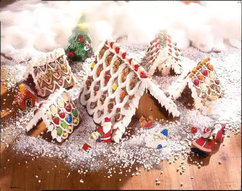 Leave the huts to dry for 15-20 minutes so that they hold together well. During this time, close the piping bag or freezer bag well so that the cast remains moist! Then spray the remaining casting onto the huts with ridge, bricks and icicles. Then stick nuts and sweets all over them. Put the huts on a tray and "snow" them with icing and hail sugar