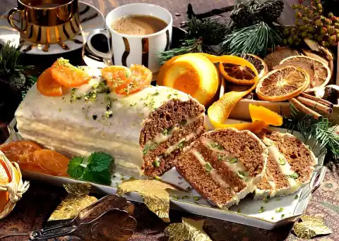 Mix baking mix, fat, egg and 1/8 litre water in a bowl to a smooth dough. Pour into a greased box form (26 cm long). Bake in a preheated oven (electric: 200°C/ gas: level 4) for 45-50 minutes. Put 3 orange slices aside. Cut remaining orange slices into pieces. Mix marzipan raw mixture, egg white and 125 g icing sugar with the kneading hoe. Stir the pistachios (up to 1 teaspoon) and orange pieces into the marzipan mixture.