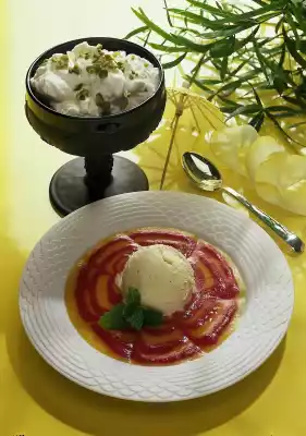 Then pull through the puree with a knife from the middle to the edge. Form four ice cream scoops with a scoop and place one in the centre of each scoop. Decorate with lemon balm. Add whipped cream and serve immediately.