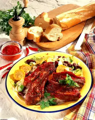 Drain the beans and corn. Clean and wash the salad and tear it into pieces. Cut the corn cobs into slices. Peel and chop onion. Cut avocado in half, stone and peel it, cut it into pieces and add it to the marinade immediately. Mix all salad ingredients and serve with the ribs