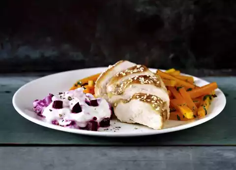 Wash parsley, shake dry, pluck leaves from the stalks and chop. Add the parsley to the carrots. Sprinkle meat with sesame seeds and cut into slices. Arrange carrots and meat on plates.