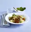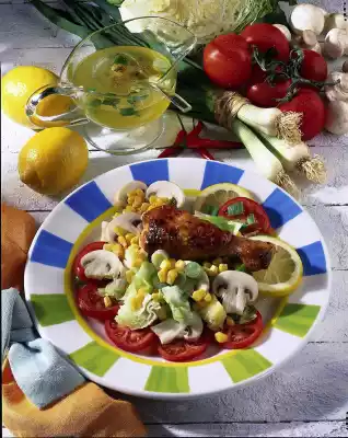Drain the corn. Clean, wash and slice the tomatoes and mushrooms. Cut iceberg lettuce into bite-sized pieces, wash and drain. For the vinaigrette, clean, wash and cut spring onion into rings. Season vinegar with salt, pepper and sugar. Gradually add 1 tablespoon of oil. Stir in the spring onion rings. Mix vinaigrette and prepared salad ingredients. Cover and leave to stand. Season to taste again before serving. Wash the chicken leg and pat dry. Season with salt and pepper. Heat the remaining oil in a coated pan and fry the chicken leg for about 5 minutes, turning it over. Brush with salsa and fry for another 5 minutes. Serve the salad and chicken leg garnished with lemon slices