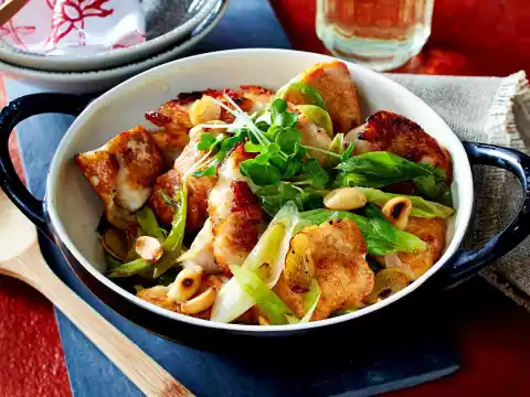Meanwhile roast the peanuts in a pan without fat for 2-3 minutes, remove and let them cool down. Clean and wash spring onions and cut into diagonal strips. Peel garlic and cut into slices.
