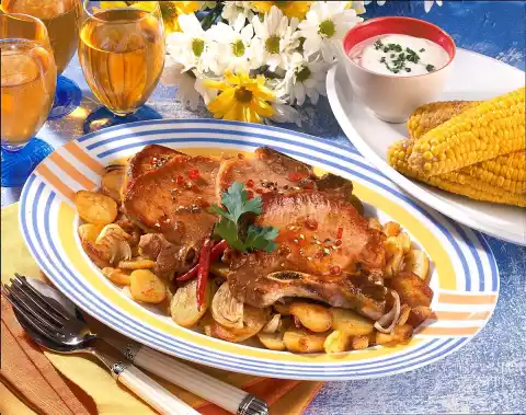 In the meantime, wash the chillies and cut them into fine rings, except for 2 for sprinkling. Drizzle honey over the chops, sprinkle with paprika and glaze the chops with it. Arrange chops with fried potatoes on a plate.