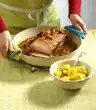 Add the onions about 5 minutes before the end of the cooking time. Season with salt and pepper. Wash chops, dab dry, season with salt and pepper. Heat the remaining oil in a frying pan and fry the chops in it for about 10 minutes while turning.