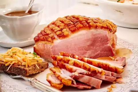 For the roast, wash the meat, dab dry and cut the rind with a sharp knife in a diamond shape, but do not cut through it. Place the roast in a roasting pan with the rind facing upwards. Roast in a preheated oven (electric cooker: 175 °C/circulating air: 150 °C/gas: see manufacturer) for approx. 1 hour.