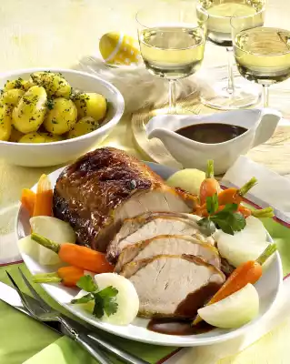 Cut the roast into slices and serve with vegetables, potatoes and sauce.