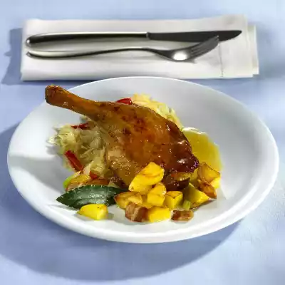Arrange sauerkraut, potatoes, duck legs and sauce on plates and serve garnished with laurel.