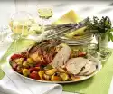 Roast in the preheated oven (electric cooker: 200 °C/ convection oven: 175 °C/ gas: level 3) for approx. 45 minutes. 10 minutes before the end of the cooking time, deglaze the legs with 250 ml broth and brush each with 1 tablespoon of jam.