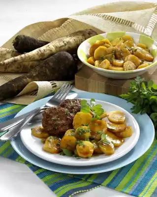 Wash the marjoram and chop it except for something to garnish. Caramelise the sugar in a pot until golden brown. Add butter, vegetable water, marjoram and possibly broth, bring to the boil. Simmer the parsnips for about 3 minutes, turning frequently. Season to taste