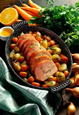 Stir starch with a little cold water until smooth. Pour into the stock and boil up briefly. Season to taste with salt and pepper. Wash parsley and cut into strips. Cut the roast open and arrange on the glazed shallots-carrot vegetables.