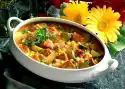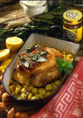 Add both to the roast 30 minutes before the end of the cooking time. Deglaze the roast stock with wine and 1/8 litre pineapple juice and let it boil down a little. Season to taste with salt and pepper. Garnish roast with lemon balm
