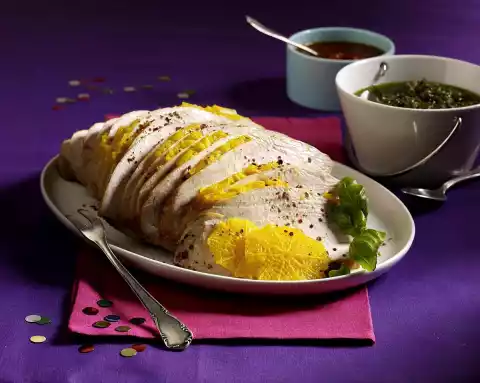 Wash the meat, dab dry and season with salt and pepper. Heat 1 tablespoon of oil in a frying pan. Fry meat on all sides for about 8 minutes. Cook in a preheated oven (electric cooker: 175 °C/ convection oven: 150 °C/ gas: level 2) for 50-60 minutes. Peel the orange so that the white skin is completely removed. Cut into slices and, except for 2 slices for garnishing, spread on the roast after 10 minutes cooking time. Meanwhile, for the pesto, roast nuts in a pan without fat. Wash the basil, shake dry, pluck the leaves from the stalks. Crush nuts, basil, except for something to garnish, parmesan and 7 tablespoons of oil with a blender. Stir in the capers. Peel the garlic and press it into the pesto using a garlic press. Season to taste with salt and pepper. For the tomato dip, peel and finely dice the onion. Heat 1 tablespoon of oil and sauté the onion for about 3 minutes until transparent. Add barbecue sauce. Wash the coriander, shake dry, chop and stir into the sauce. Warm up the jam and coat the roast about 15 minutes before the end of the cooking time. Take the finished roast out of the oven and let it rest for about 5 minutes. Cut into slices, sprinkle with chilli flakes and garnish with basil and other orange slices. Add sauces