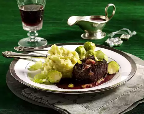 Peel, wash and quarter the potatoes. Cook in boiling salted water for about 20 minutes. Clean and wash the Brussels sprouts and cook in boiling salted water for about 15 minutes. Wash the meat, dab dry and season with salt and pepper.