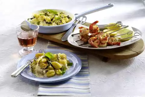 4) Wash, pluck and finely chop the parsley and dill. Heat 2-3 tablespoons of oil in gnocchibrate fat. Fry shrimp skewers for 2-3 minutes, turning them over. Fry the rest of the garlic, dill and parsley briefly. Season with salt and pepper and remove. Arrange everything. Wash the lemons, dab dry, cut in half lengthwise and serve with the prawns.