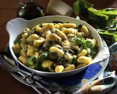 Heat the oil. Sauté garlic and onion in it. Sauté rocket, basil and gnocchi in it. Pour into an ovenproof dish. Grate cheese, sprinkle over it and season with pepper. Bake in a preheated oven (electric: 225 ° C/ gas: level 4) for five minutes.