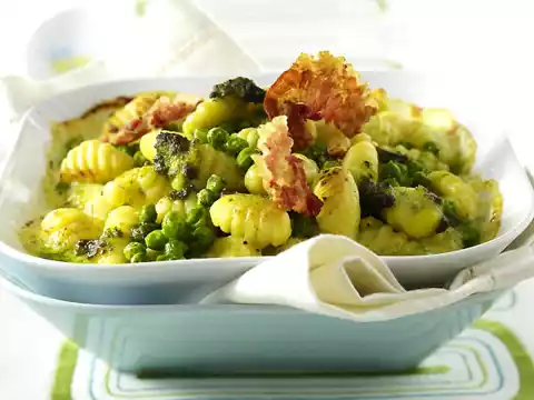 Mix uncooked gnocchi, frozen peas and pesto cream. Pour into a greased casserole dish. Tear the bacon into small pieces and spread on top. Bake in a preheated oven for 20-25 minutes.