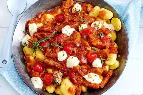 Mix in the gnocchi and heat. Spread 100 g mascarpone in flakes on top. Serve immediately.