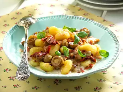 Heat the oil in a frying pan. Fry the bacon in it until crispy, take it out. Fry the mushrooms in the bacon fat until they are firm. Add gnocchi, bacon and tomatoes and fry briefly. Add cream and bring to the boil. Season to taste with salt and pepper.