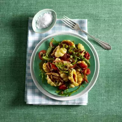 Pour in broth and bring to the boil. Season to taste with salt, Sambal Oelek and sugar. Add tomatoes, tuna and capers and warm up briefly. Drain the pasta. Mix noodles, sauce and rocket and arrange on a plate.