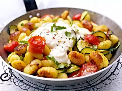 Heat the oil in a large frying pan. Fry the uncooked gnocchi for 2-3 minutes. Add the zucchini slices and fry for about 3 minutes. Add tomatoes and fry briefly. Season with salt and pepper.