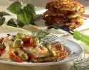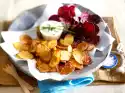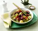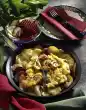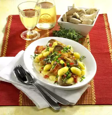 Cut the flesh into small cubes. Wash and chop thyme. Melt 1 tablespoon of butter and sauté the flour in it. Add cream and stock, stirring constantly, and simmer for 2 minutes. Heat peas and tomatoes in it. Season with salt and pepper. Heat 1 tablespoon butter. Skip the bacon. Sauté mushrooms briefly, season with salt, pepper and thyme. Swirl the gnocchi in the cooking fat.