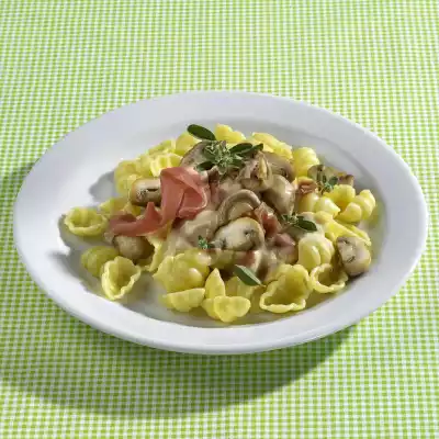 Clean, clean and halve the mushrooms. Peel and finely chop the onion. Cut 2 slices of Parma ham into medium sized cubes. Cook the pasta in boiling salted water for about 8 minutes.