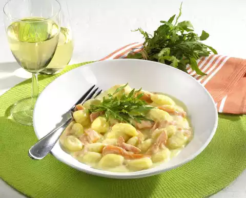 Drain gnocchi well. Add salmon and rocket to the sauce and let it stand for a short time. Season to taste again