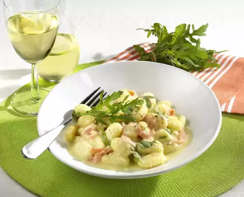 Season with salt and pepper. Cut salmon into strips. Add gnocchi and salmon to the sauce and heat. Clean and wash the rocket and cut it into wide strips except for a little garnish.