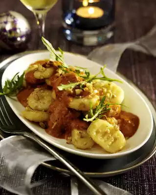 In the meantime clean, wash and drain the rocket. Roughly chop the nuts. Heat 3 tablespoons of butter in a frying pan. Roast the nuts in it. Roast the gnocchi in the nut butter for 2 minutes. Mix with rocket and tomato sauce and serve