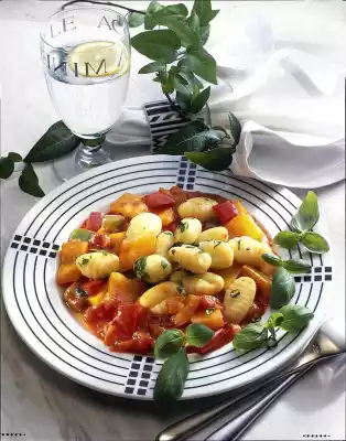 Cook the gnocchi in boiling salted water for about 2 minutes. Serve with vegetables and basil.