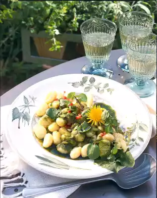 Clean, wash, quarter and seed the tomatoes. Finely dice the flesh. Arrange gnocchi and pesto sprinkled with tomatoes. Serve garnished with dandelion leaves and flowers, some watercress and pistachios