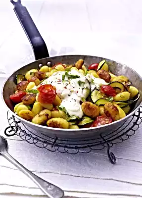 Heat the oil in a frying pan. Fry the uncooked gnocchi for 2-3 minutes. Add the zucchini and fry for about 5 more minutes. Add tomatoes and fry briefly. Season with salt and pepper