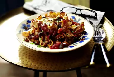 Preheat oven (electric cooker: 200 °C/circulating air: 180 °C/gas: see manufacturer). Season sauce again with salt, pepper and sugar, mix with pasta and pine nuts. Put everything into a large casserole dish.