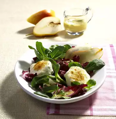 Wash the pear, possibly peel, quarter, core and cut into slices. Mix salad and vinaigrette. Serve with pear and goat cheese