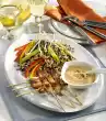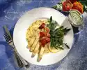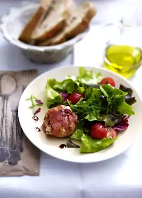 Wrap the goat cheese with 4 slices of bacon each. Heat olive oil in a coated pan. Fry the cheese thalers in it for 4-5 minutes while turning them over. Mix tomatoes, lettuce and vinaigrette in a bowl.