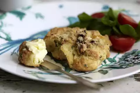 Add cold butter to the flour mixture. Rub in coarse crumbs with your fingertips. Do this quickly! Stir in the milk and egg mixture briefly and then add the cheese mixture. Stir only so long, until just such a dough develops.