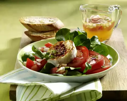 Toast slices of bread in a toaster. Sprinkle goat cheese with sugar. Caramelise briefly under the hot grill for 1-2 minutes. Arrange salad and tomato slices on a plate. Drizzle with vinaigrette.
