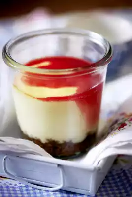 In the meantime, thaw the raspberries for the sauce. Then puree with 30 g icing sugar and pass through a fine sieve. Spread the raspberry sauce on the cheese cakes.